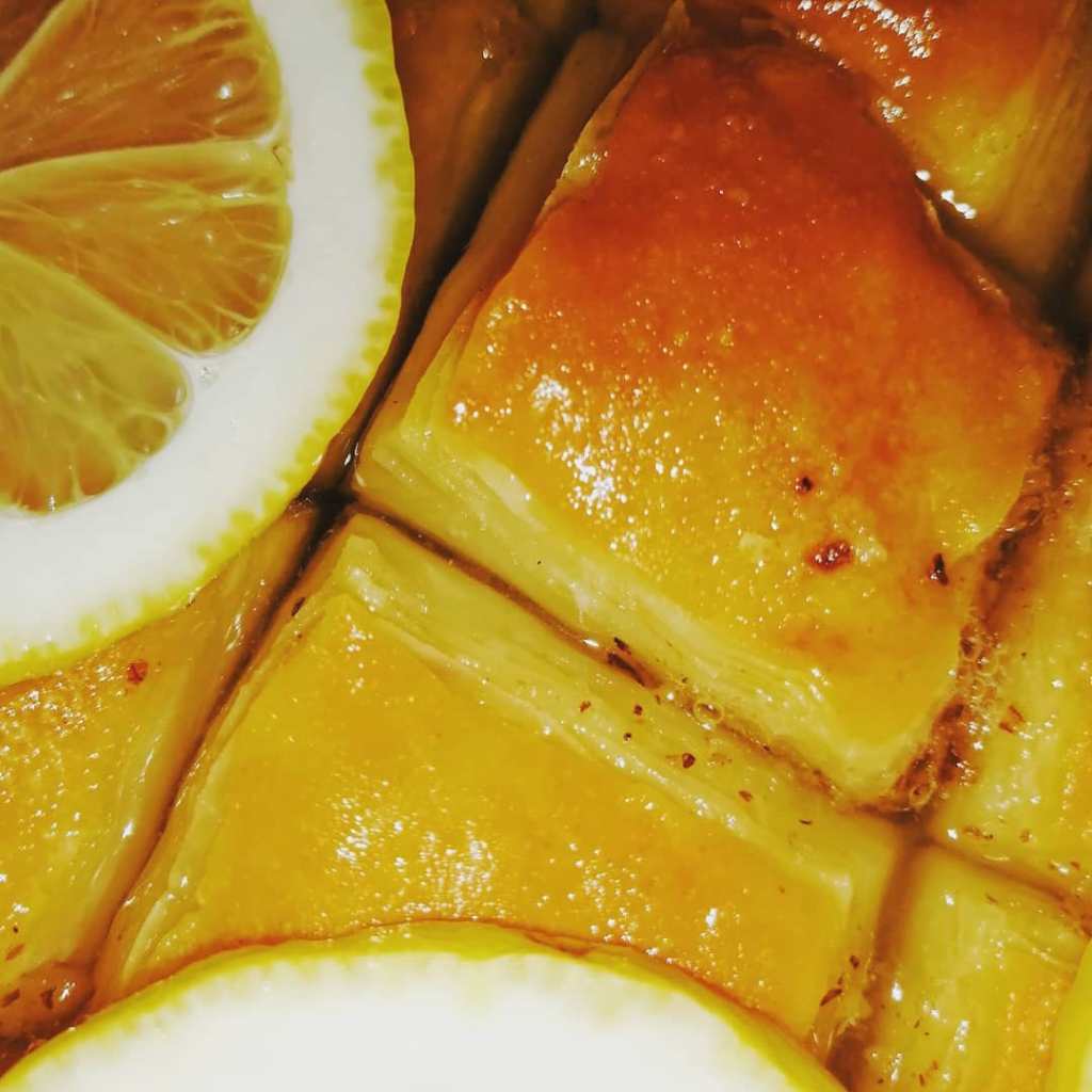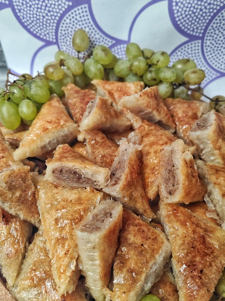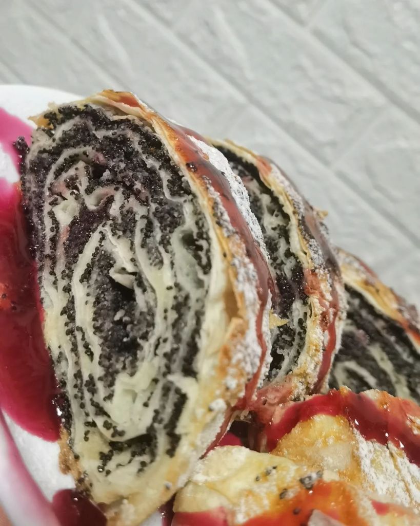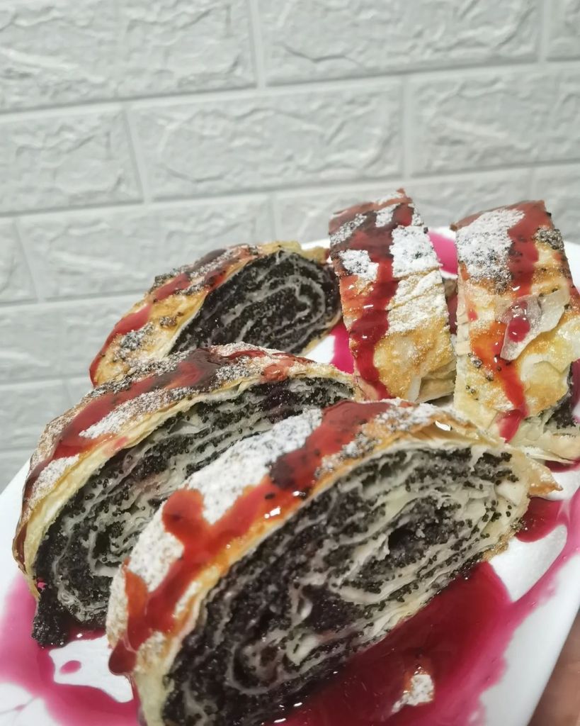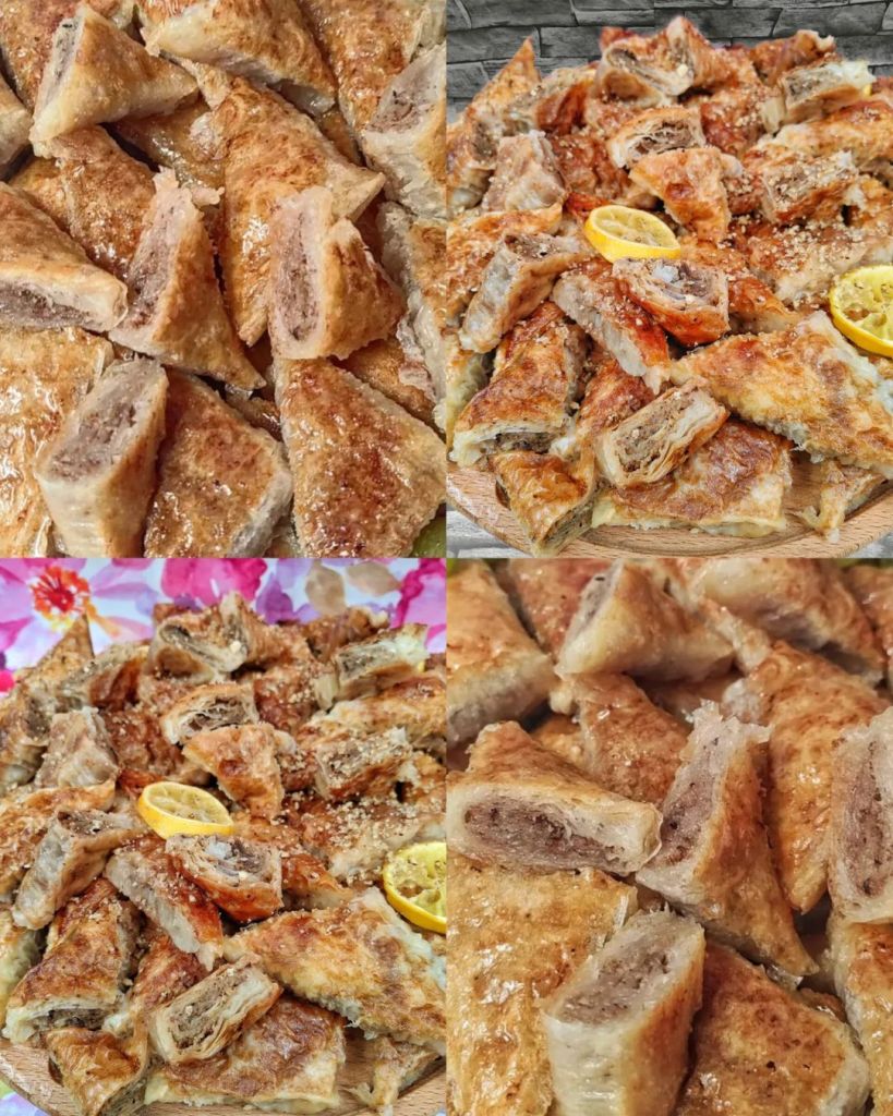 Koru presaviti po dužini, od kraja do polovine kore, pa tako i drugi kraj. A zatim celom širinom na pola, kao u video za pica trougliće. Premazati rastvorom umućenih jaja sa uljem pa dodati pola kašike seckanih a pola mlevenih oraha. Urolati koru pod uglom od devedeset kao pravougli trougao. Ponoviti postupak sa svim korama. Ređati u podmazani pleh, pa zaliti rastopljenim puterom pa peći 20 minuta na 200 a zatim još 15 minuta na 180.a zatim dok su vruće preliti ohlađenom agdom. Preko naređati kolutove limuna.