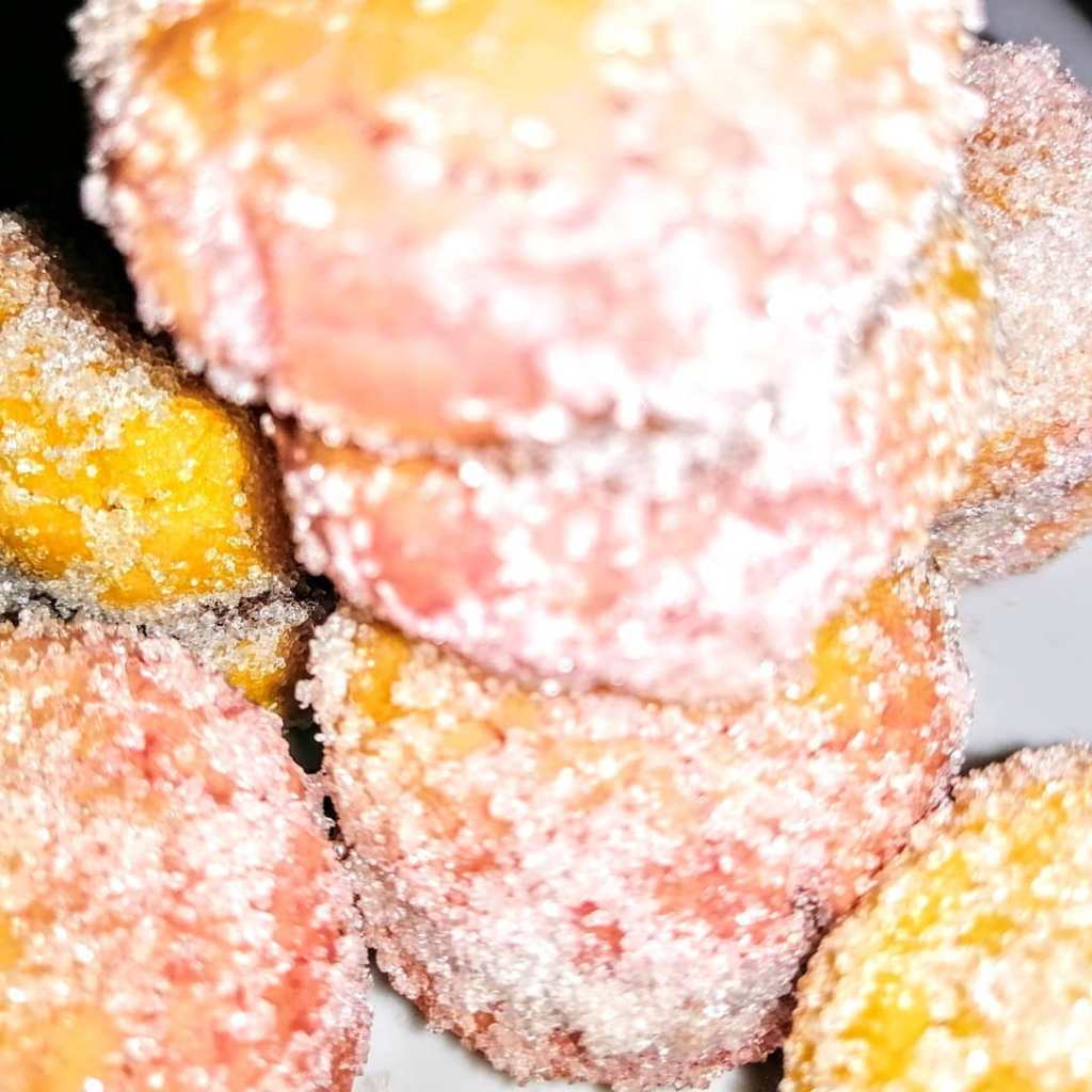 Mrvice od kuglica pomešati sa domaćim džemom od šljiva i dodavati rum. Puniti kuglice. Spojiti po 2 kuglice zajedno. Pripremiti dve posude sa bojama i dodati kašiku dve farbe za hranu rastvorenu u 70ml vode, kao i pola flašice ekstrakta od breskve pa zamočiti jsvaku stranu u drugu farbu. Natopljene breskvice naređati na pleh obložen ubrusom da se malo ocede, uradite 7-8 breskvica, pa ih onda uvaljati u kristal šećer. Kad završite sa farbanjem prekriti kolače pamučnom krpom da se osuše 3-4 sata.