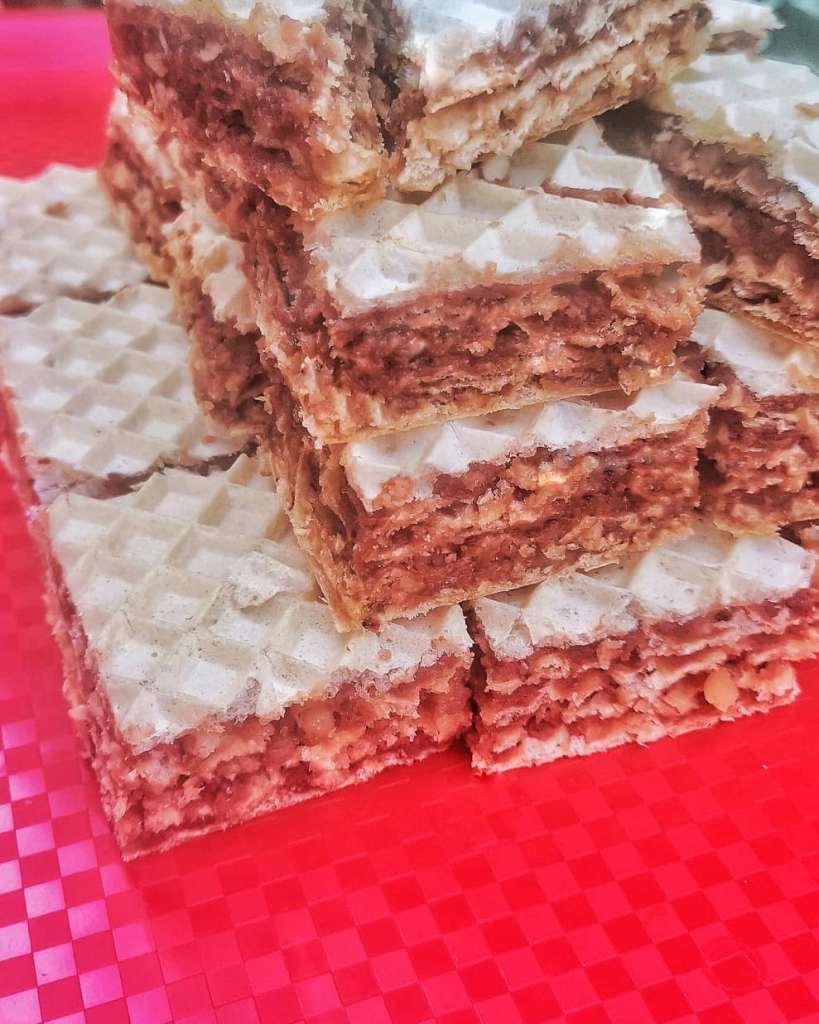 Kad završite sa valjanje krenite od prve, gustinom pobrašnjavite radnu površinu pa svaku lopticu razvući tanko kao palačinku, posoliti gustinom i ređati jednu preko druge 40 komada. Zatim svih 40 razvući na širinu tepsije, oko 36cm, staviti koru u tepsiju pa preliti sa pola otopljenog margarina. Zatim posuti sve mlevene orahe, I ponoviti postupak sa drugom korom, pa je odmah iseći na kockice.