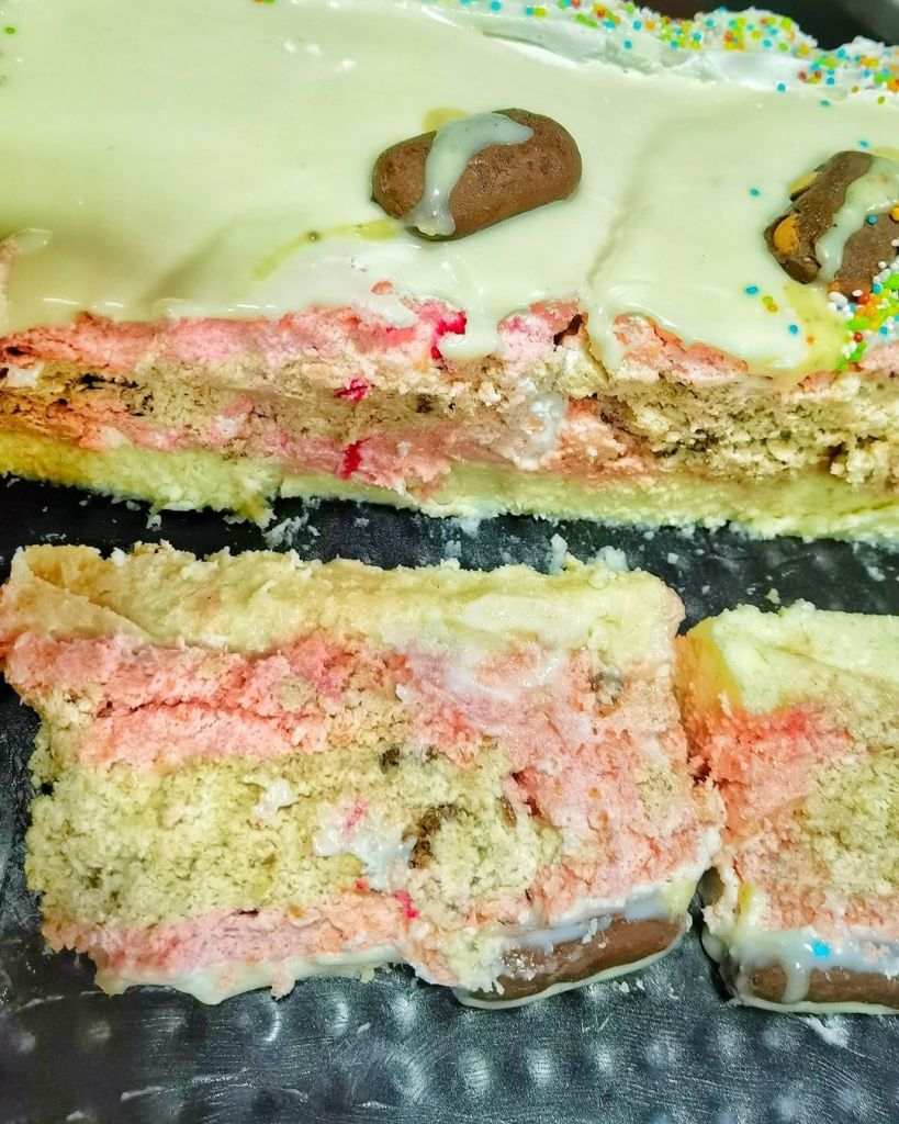 Filovati redom, kora, pola žutog fila, voćni fil, druga polovina žutog fila. Ukrasiti po želji.